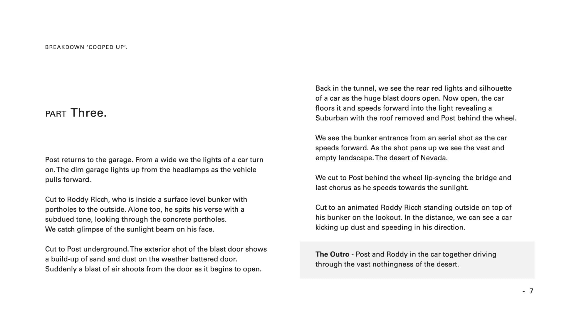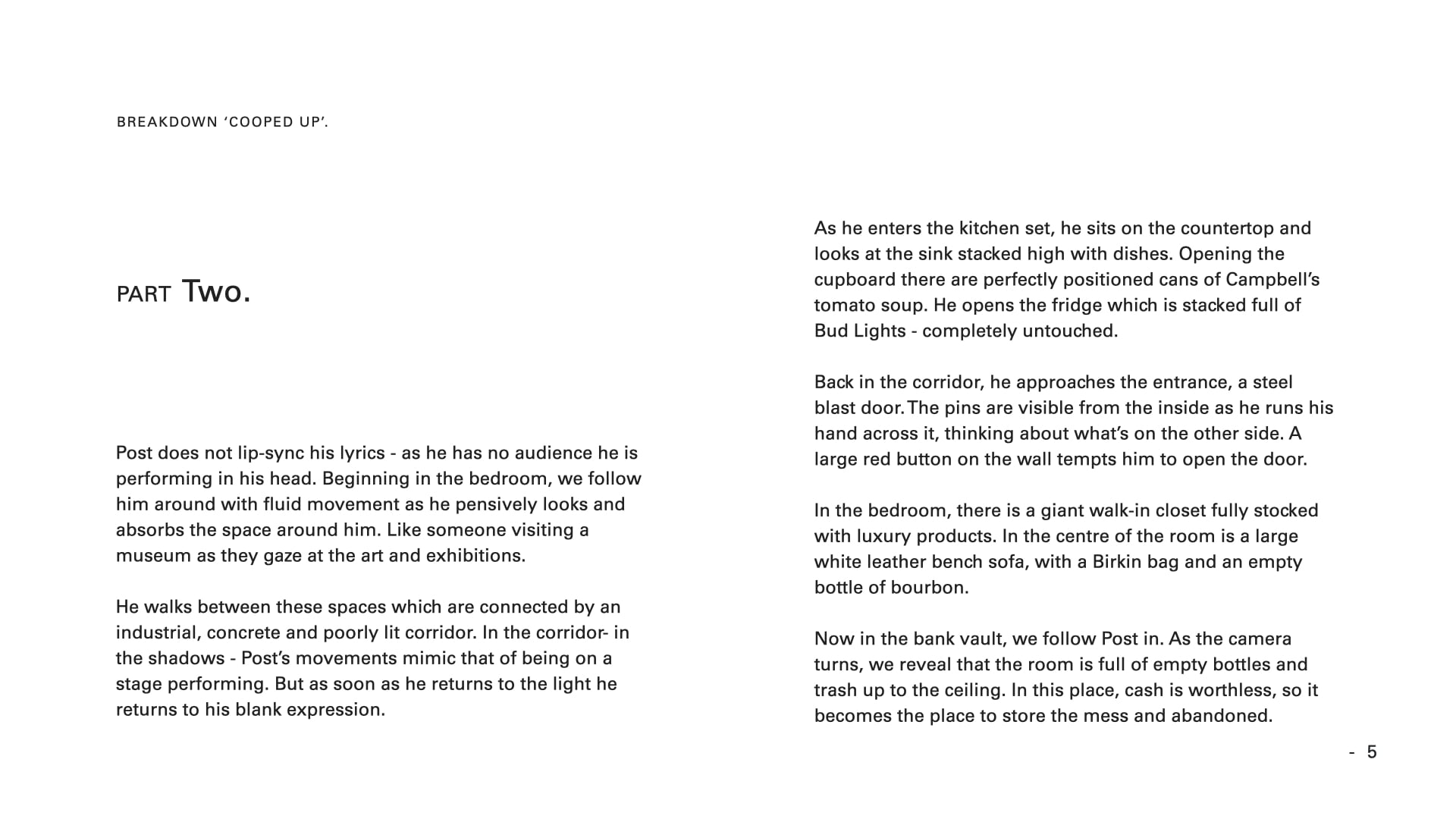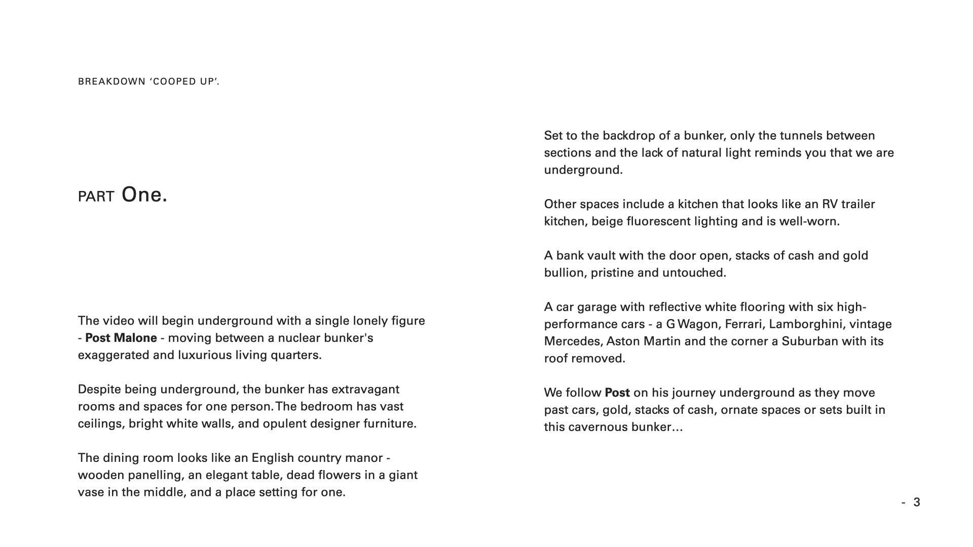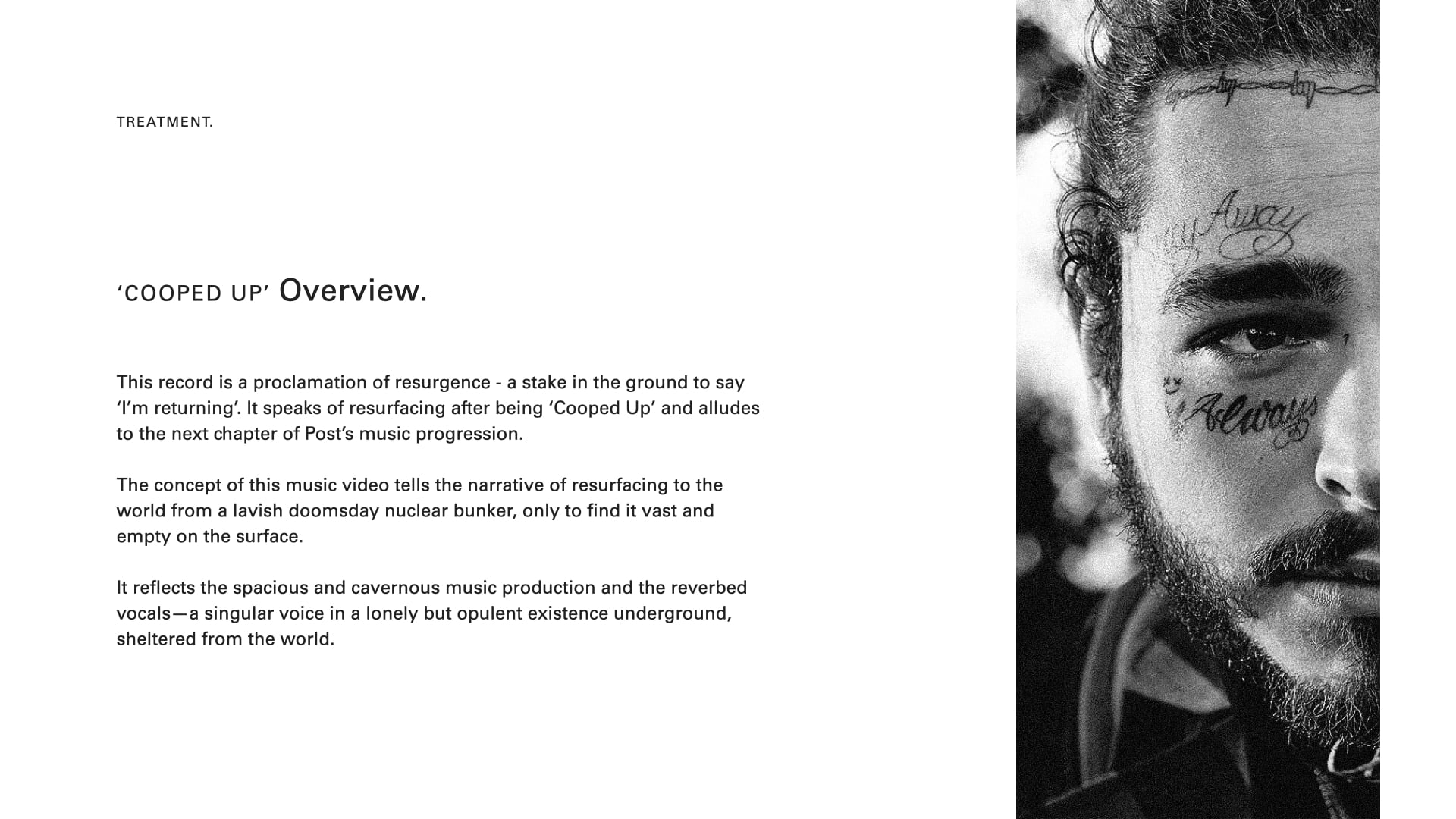 This is a treatment for Post Malone’s ‘Cooped Up’, released in May 2022, submitted for consideration by his management.