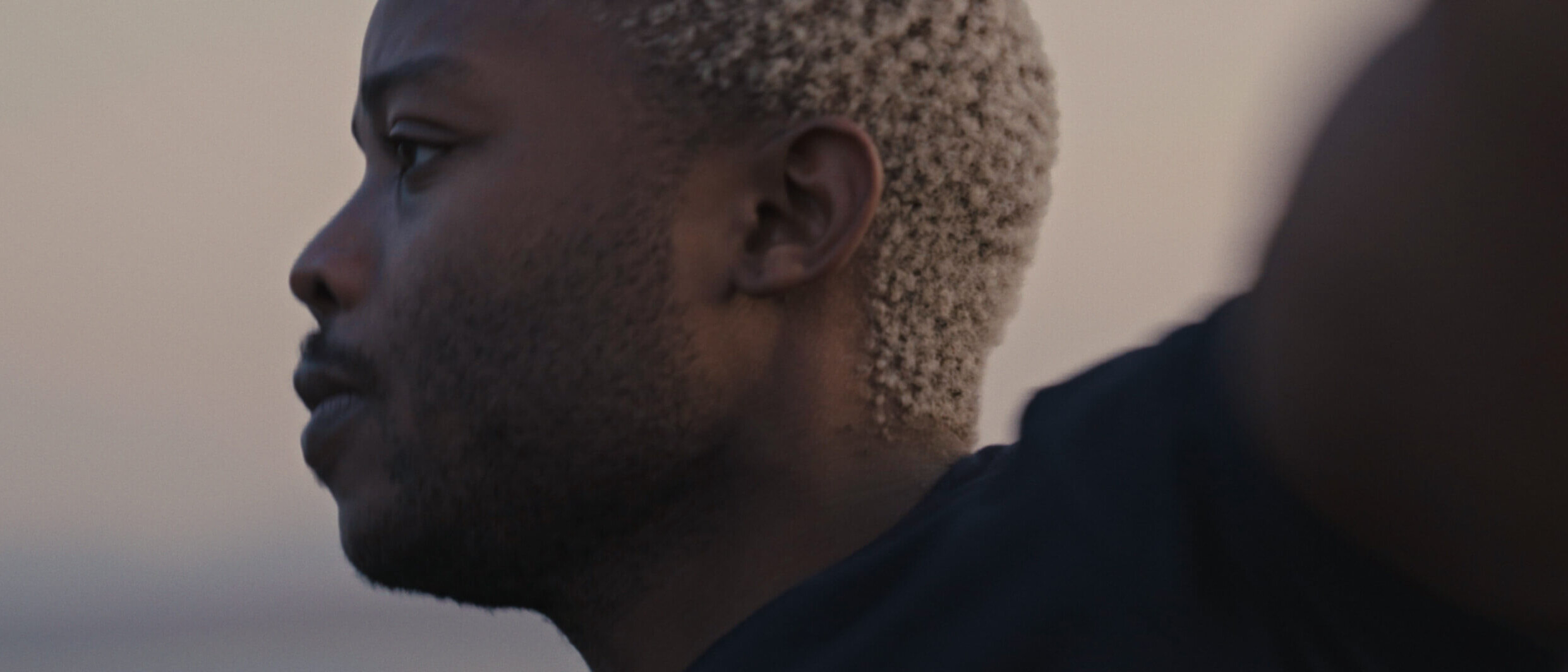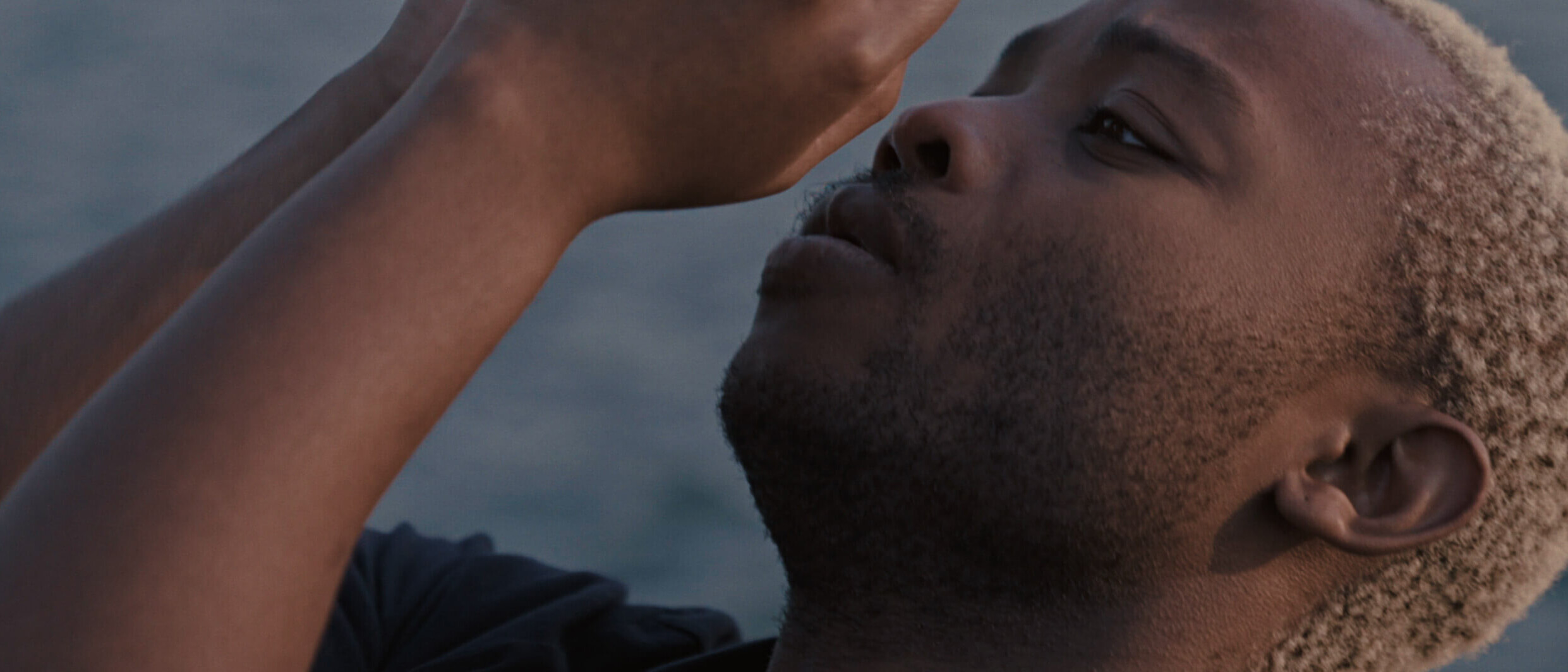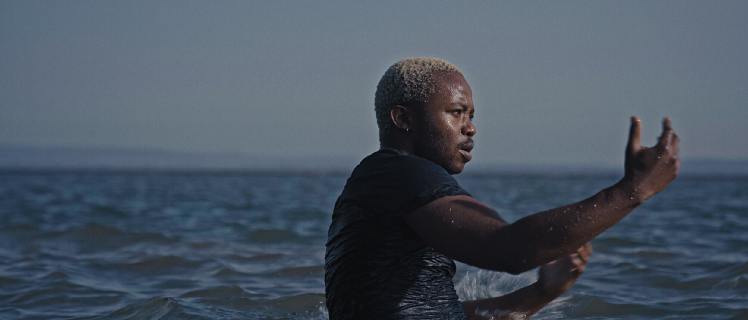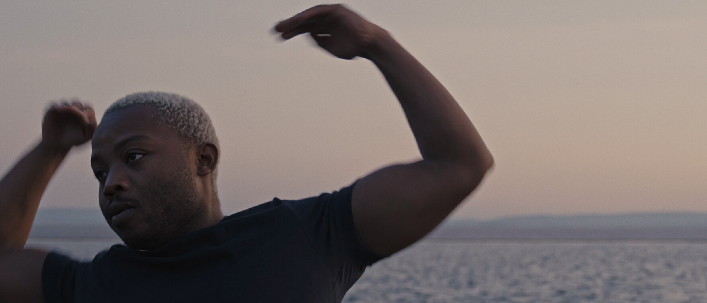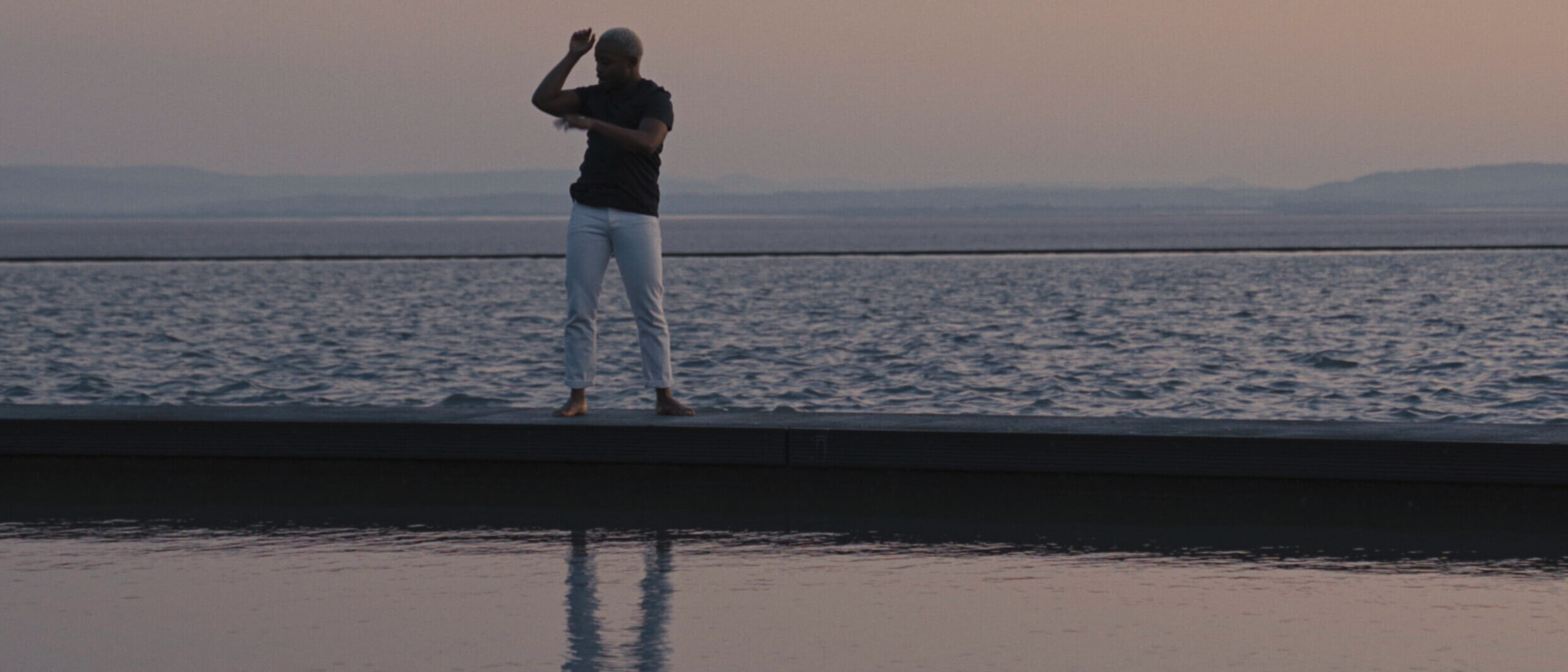 In the early dawn, the camera frames water and reflections, introducing interpretive dancer Bakani preparing for his performance in the ‘Familiarity’ costume.
