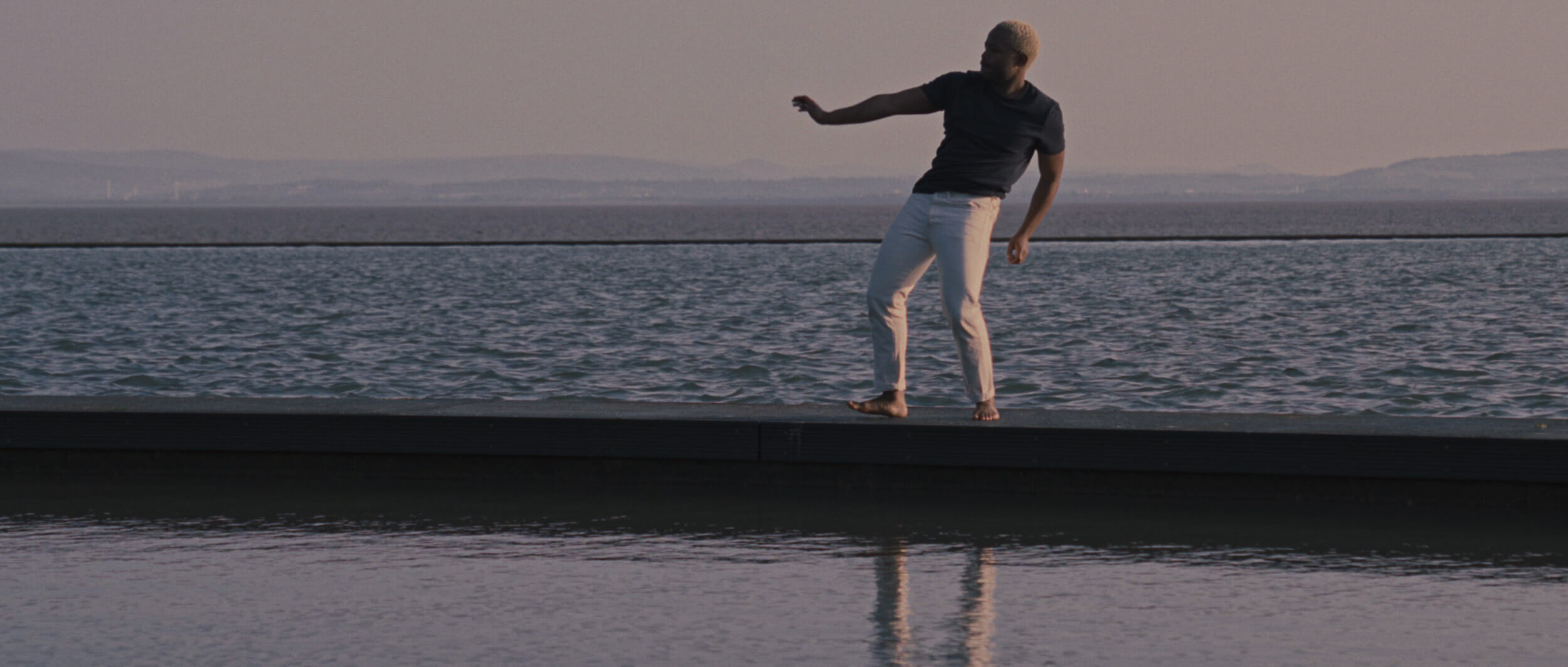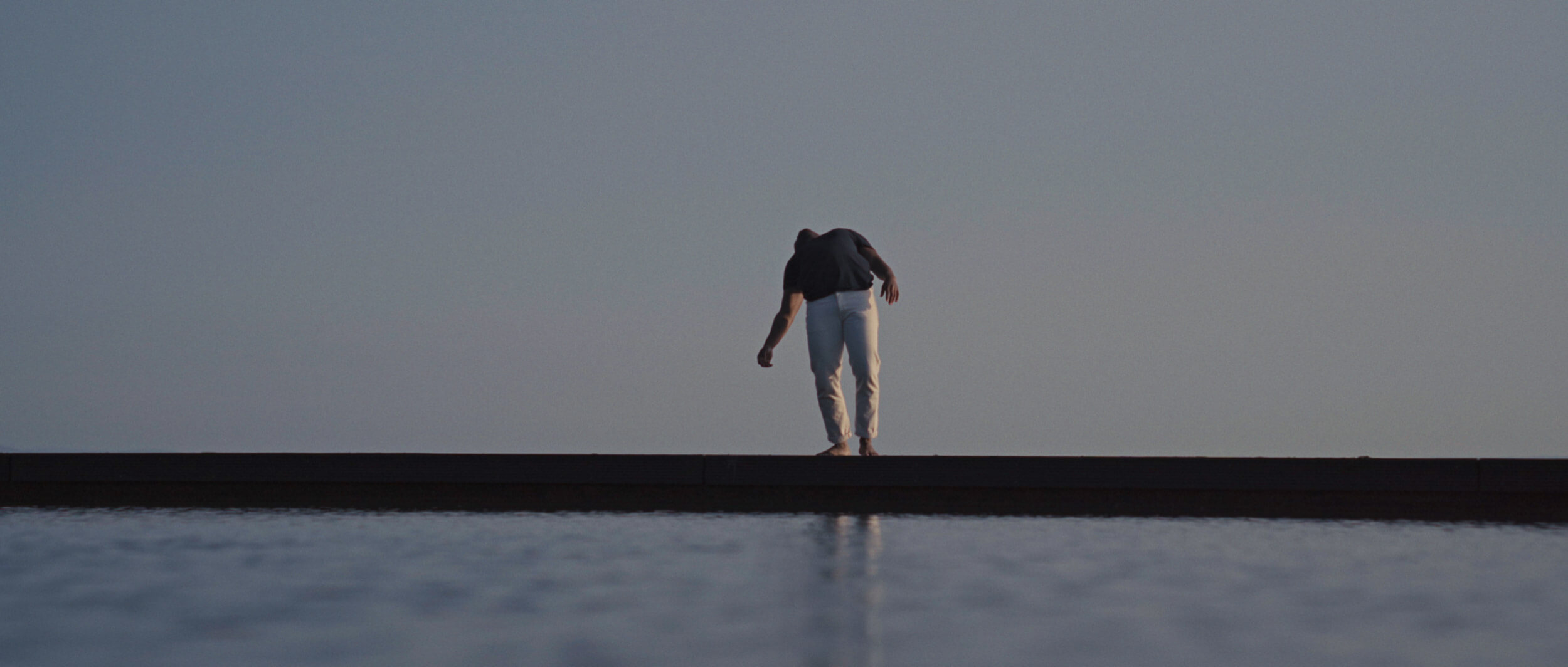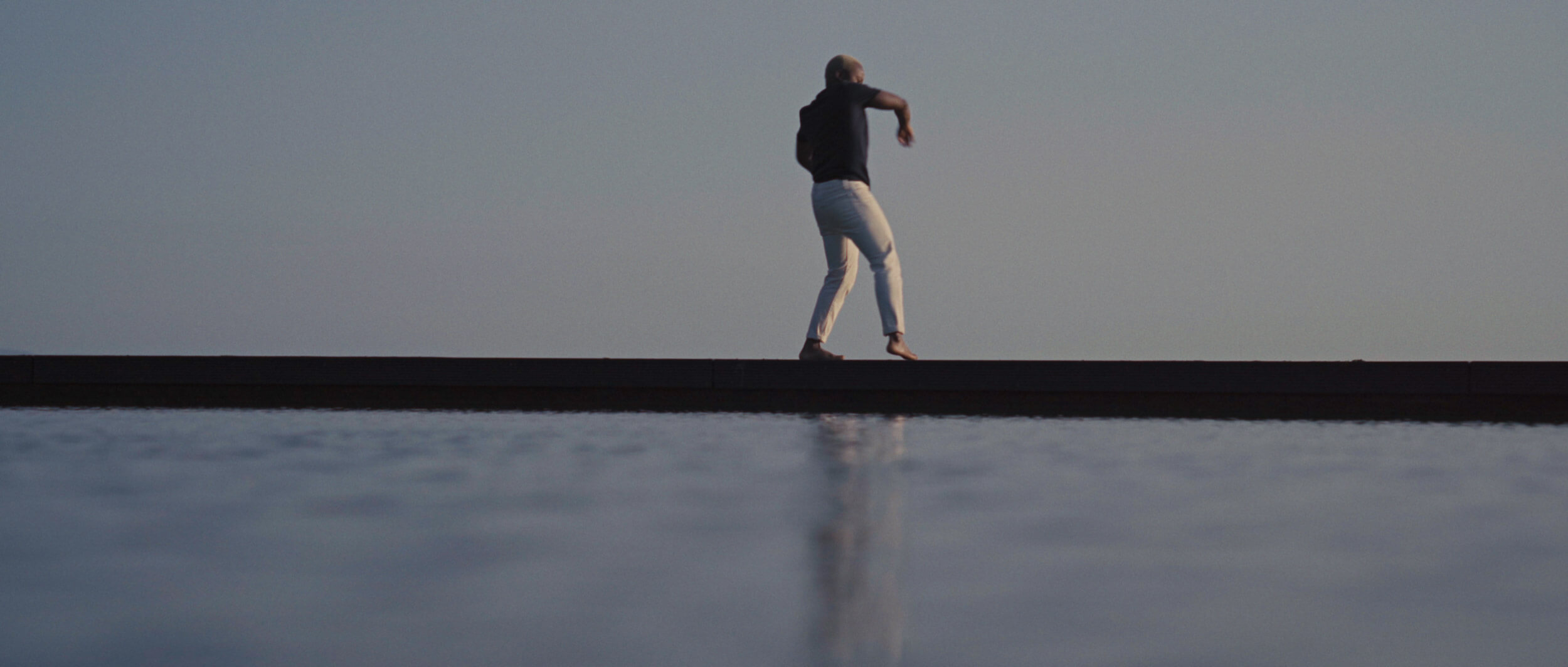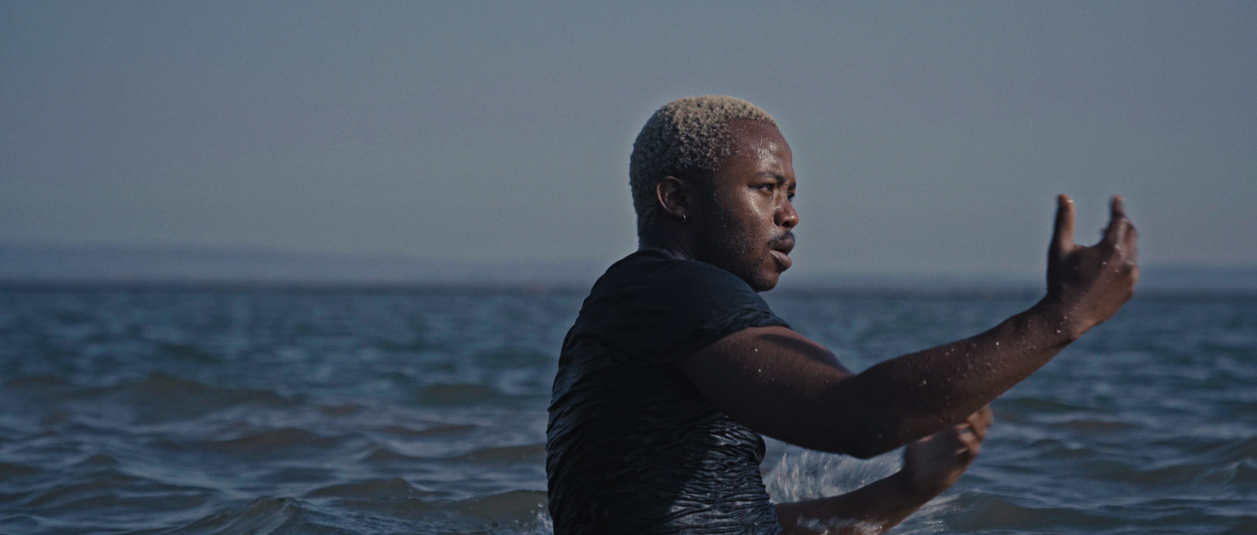 In the early dawn, the camera frames water and reflections, introducing interpretive dancer Bakani preparing for his performance in the ‘Familiarity’ costume.